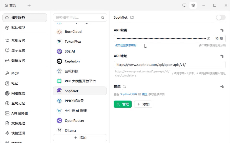 - 添加SophNet提供商:点击 ⚙️设置 -> 模型服务 -> 选择 SophNet -> 粘贴刚刚保存的 API Key 密钥。