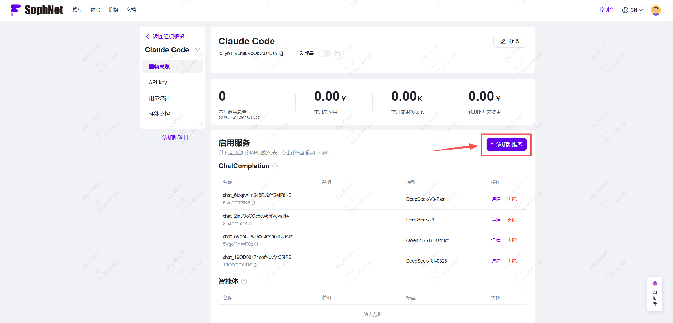 创建后点击项目列表中 详情,在项目详情页进入 服务总览,点击 创建新服务