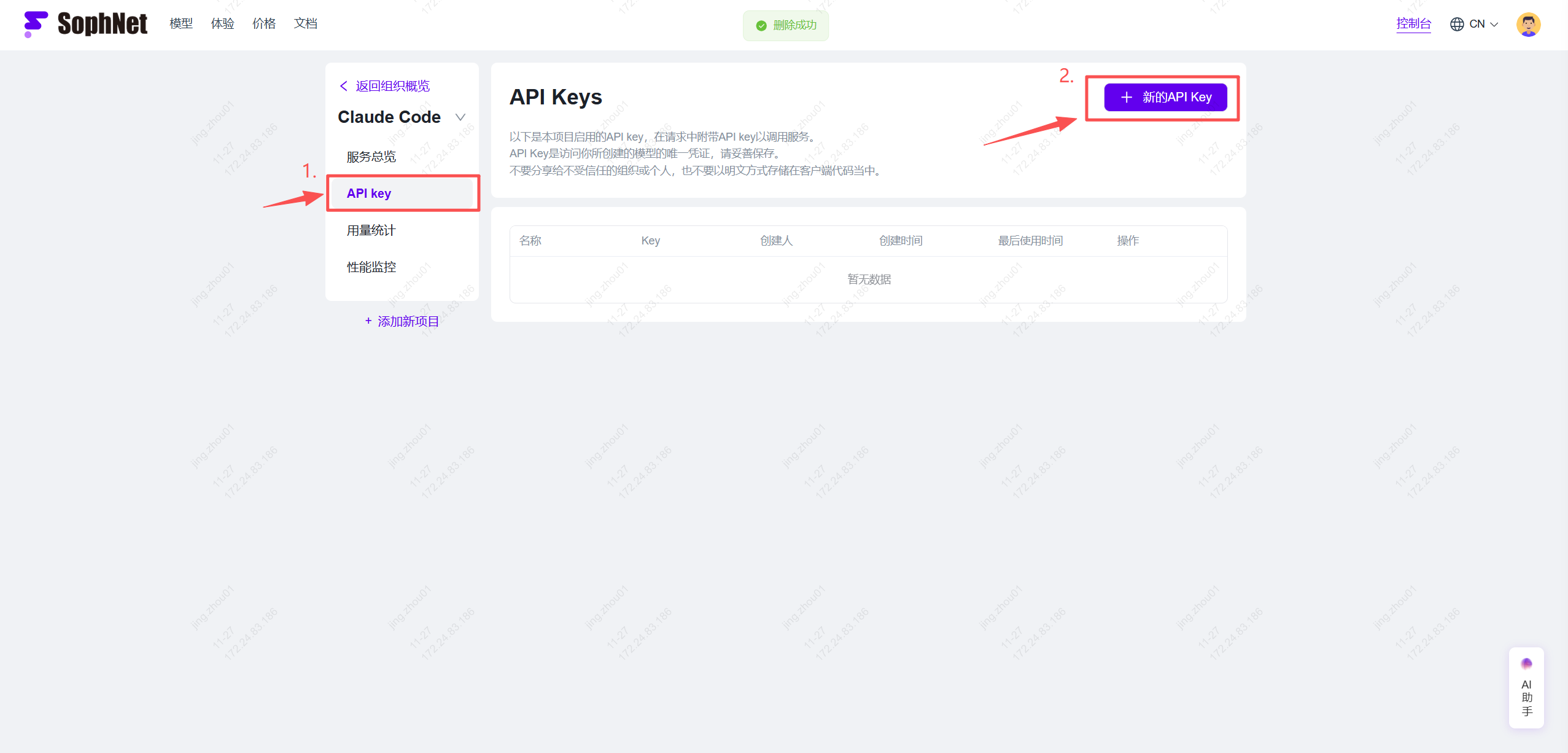 在左侧菜单找到:API Key → 新的 API Key,保存生成的 API Key,后续配置将使用。